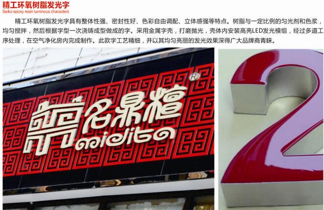 二、樹脂發光字,樹脂發光字是由字殼、發光源兩部分組成。其中外殼部分采用液態高分子樹脂材料一體澆筑成型,或者用金屬圍邊樹脂倒面;發光光源采用的是超高亮度半導體發光二極管(LED),21世紀的綠色光源。