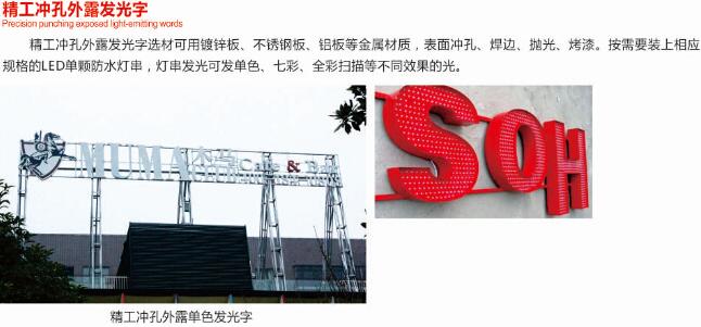 三、外露發光字,外露發光字按顏色分為單色,七彩,全彩發光字。單色發光字是由打好孔的字殼,和單色外漏燈組成。七彩外露發光字是由打好孔的字殼,和七彩外漏燈,七彩控制器構成,打燈之后可以七彩漸變。