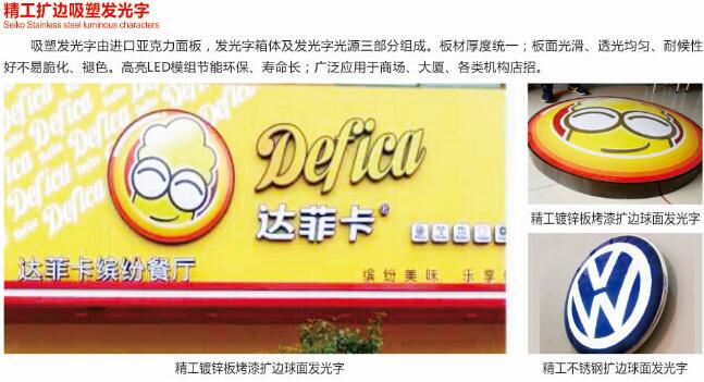 四、吸塑發光字,LED吸塑發光字由壓克力吸塑面板、發光字箱體、及發光字光源三部分組成。字面板是由吸塑機在亞克力板材上吸出一個面,箱體由金屬或者PVC圍好,發光字光源是采用超高亮度LED光源。